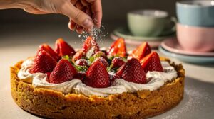 Zodra de eerste Nederlandse aardbeien eind maart in de winkels verschijnen, begint het in de keuken te kriebelen. Hoewel ze wat kleiner zijn dan de zomerse varianten, is het die intense zoet-zure geur, die natte aardse toon, die het signaal afgeeft. De lente is begonnen, en de koelkast staat klaar met het antwoord. Deze aardbeientaart zonder oven is ontstaan uit het verlangen naar iets lekkers zonder de oven te hoeven gebruiken: een knapperige koekjesbodem, een wolkachtige mascarponecrème en glanzende aardbeien die voor zichzelf spreken, allemaal binnen een kwartier samengevoegd.