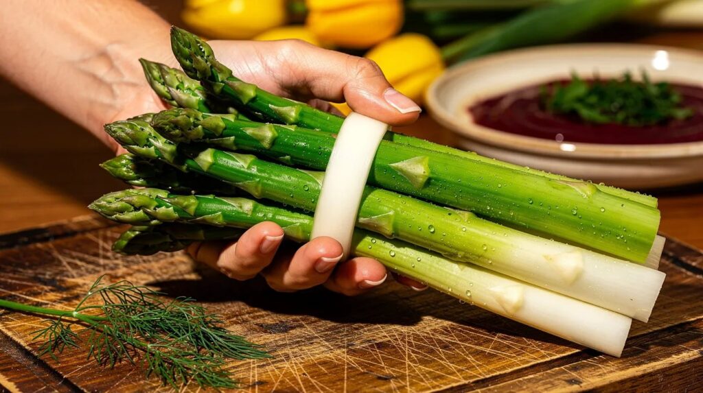 Een tweede idee: snijd rauwe asperge in dunne plakjes, marineer ze twintig minuten in olijfolie, citroensap, zout en verse munt, en serveer als frisse voorjaarsalade met geraspte harde kaas. De zuurgraad van het citroensap denatureert — breekt structuren in de celwanden af — de asperge subtiel, waardoor ze zachter van bite worden zonder hitte.