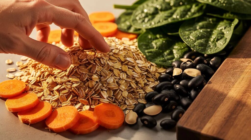 | Onoplosbaar | Darmbeweging, passagetijd, volumevorming | Volkorengranen, spinazie, groene asperges, wortelen | ~15–20 g |