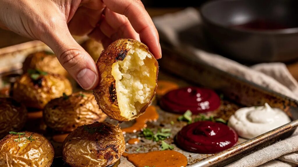 Voeg aan het kookwater voor het voorkoken een eetlepel appelazijn toe. Het licht zure milieu versterkt de buitenste celwand van de aardappel, waardoor die tijdens het bakken nog steviger blijft. Het effect is subtiel maar merkbaar: de korst die u krijgt, houdt langer zijn structuur — ook na het uitnemen uit de oven. In de lente, wanneer u verse kruiden uit de tuin of de markt heeft, kunt u in de laatste 5 minuten een takje rozemarijn of tijm op de bakplaat leggen. De kruiden schroeien licht aan en geven hun aroma af zonder te verbranden.