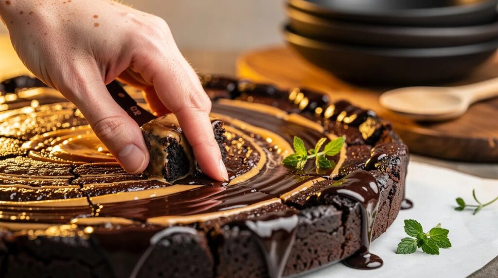 Haal het blik uit de oven en laat de brownie minstens dertig minuten afkoelen in het blik op een rooster. De structuur zet zich verder buiten de oven: het midden stolt nog na door de restwarmte. Wie te vroeg snijdt, krijgt een brownie die uit elkaar valt en er rauw uitziet. Geduld is hier niet alleen een deugd — het is een technische noodzaak. Til de afgekoelde brownie met het bakpapier uit het blik en snijd met een scherp mes dat u tussen elke snede afveegt in zestien gelijke blokjes.