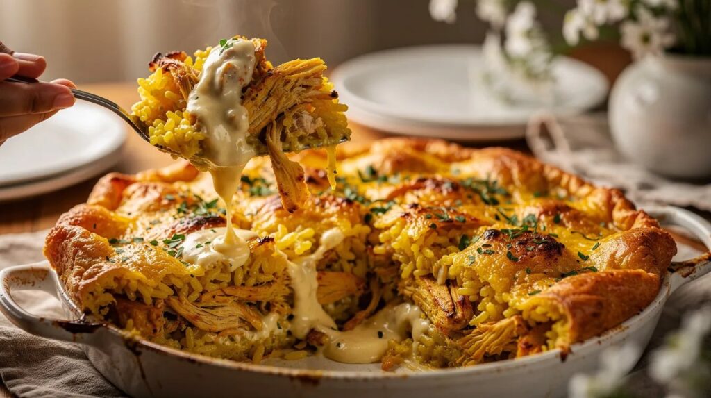 Wanneer de eerste lentebuien neerslaan en de avonden nog fris aanvoelen, is er weinig bevredigender dan een schaal die dampend de oven uit komt. Rijst die in de oven gaart met kip en room is geen ingewikkelde keukentruc — het is een techniek die het verschil maakt tussen korrels die plakken en piepen, en een smeuïge, samenhangende schotel waarbij het vocht volledig door de rijst is opgenomen. Precies dat onderscheid staat hier centraal.